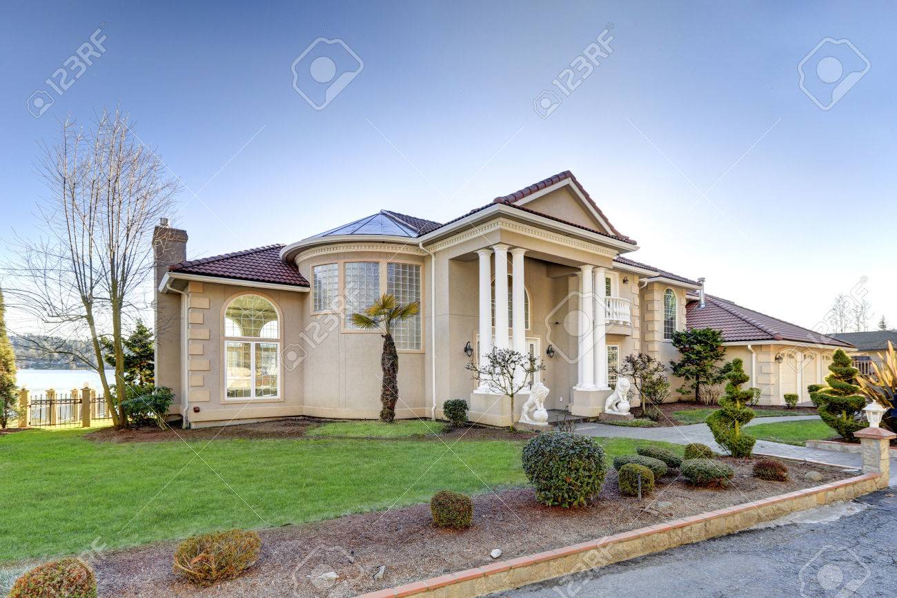 Estilo Mediterraneo Frente Al Mar De Lujo Caracteristicas De La Casa Techo De Azulejos De Baja Inclinacion Paredes De Estuco Porche Columnado Y Motivos De Arco El Diseno Del Paisaje Bien Cuidado